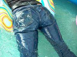 Nasse levis 501, nasse jeans und lederjeans, baden in jeansjacke und jeans.